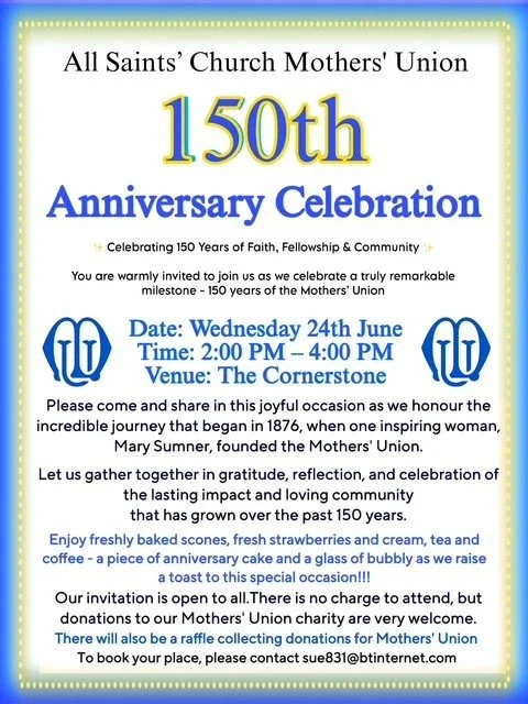 150th Anniversary Celebration - Wokingham All Saints Wednesday 24 June 2026 14:00 16:00 The Cornerstone, All Saints Church Norreys Ave, Wokingham RG40 1UE UK (map) Google Calendar ICS